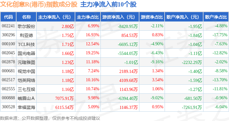 资金流向方面,文化创意R(港币)(480047)指数成份股当日主力资金净流出合计4.47亿元,游资资金净流出合计1.23亿元,散户资金净流入合计5.7亿元。成份股资金流向详情见下表:
