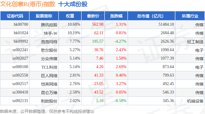 文化创意R(港币)(480047)指数十大成份股详情如下: