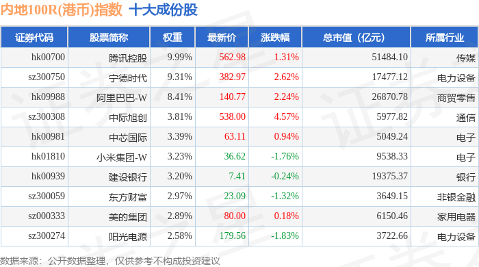 内地100R(港币)(483002)指数十大成份股详情如下: