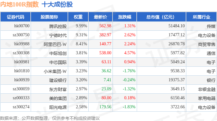 证券之星消息,12月1日,内地100R(483001)指数报收于2872.88点,涨0.94%,成交1850.12亿元,换手率0.53%。当日该指数成份股中,上涨的有69家,中兴通讯以10.0%的涨幅领涨,下跌的有29家,泡泡玛特以4.27%的跌幅领跌。
