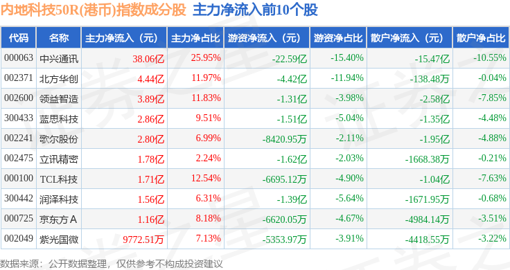 资金流向方面,内地科技50R(港币)(483004)指数成份股当日主力资金净流入合计44.37亿元,游资资金净流出合计30.06亿元,散户资金净流出合计14.32亿元。成份股资金流向详情见下表: