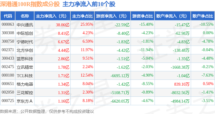 资金流向方面,深港通100R(483007)指数成份股当日主力资金净流入合计33.75亿元,游资资金净流出合计35.1亿元,散户资金净流入合计1.36亿元。成份股资金流向详情见下表: