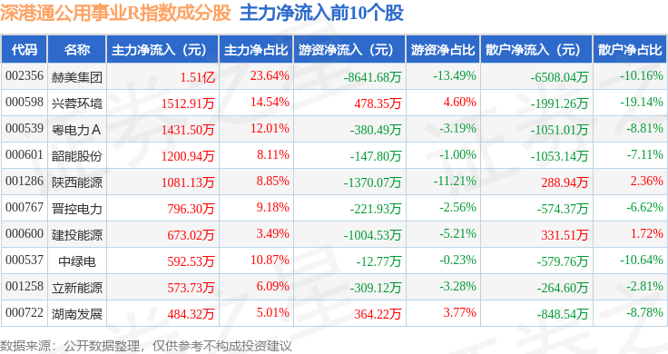 资金流向方面,深港通公用事业R(483031)指数成份股当日主力资金净流入合计7364.21万元,游资资金净流出合计3150.19万元,散户资金净流出合计4214.01万元。成份股资金流向详情见下表: