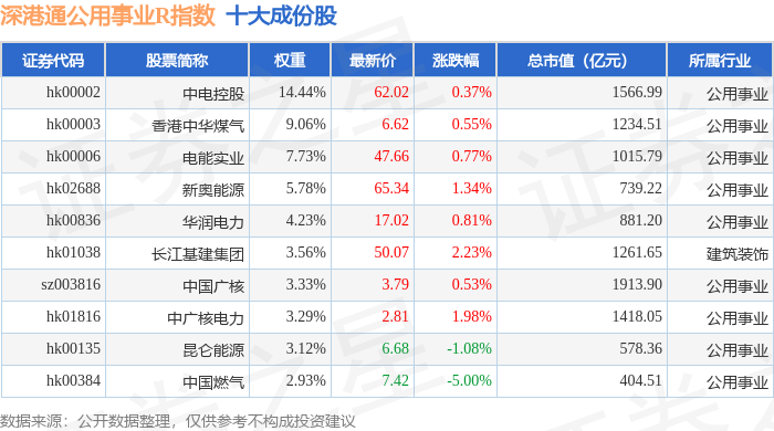 深港通公用事业R(483031)指数十大成份股详情如下: