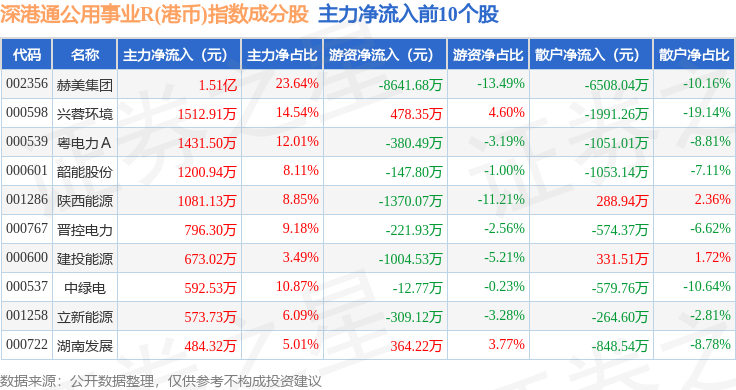 资金流向方面,深港通公用事业R(港币)(483032)指数成份股当日主力资金净流入合计7364.21万元,游资资金净流出合计3150.19万元,散户资金净流出合计4214.01万元。成份股资金流向详情见下表: