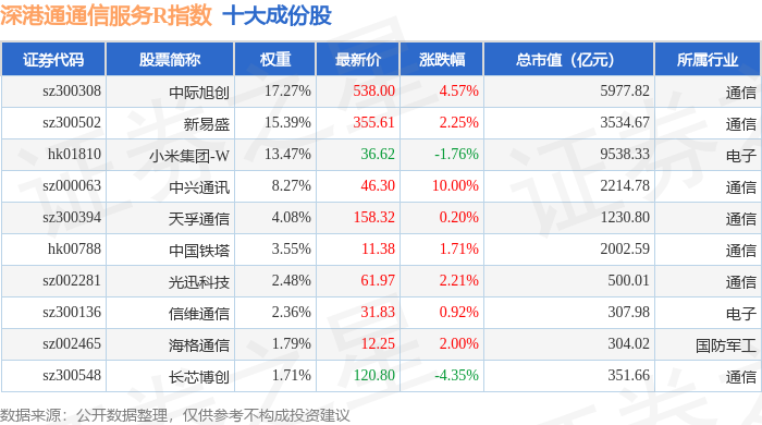 深港通通信服务R(483033)指数十大成份股详情如下: