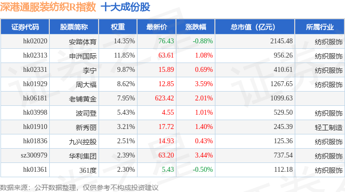 深港通服装纺织R(483041)指数十大成份股详情如下: