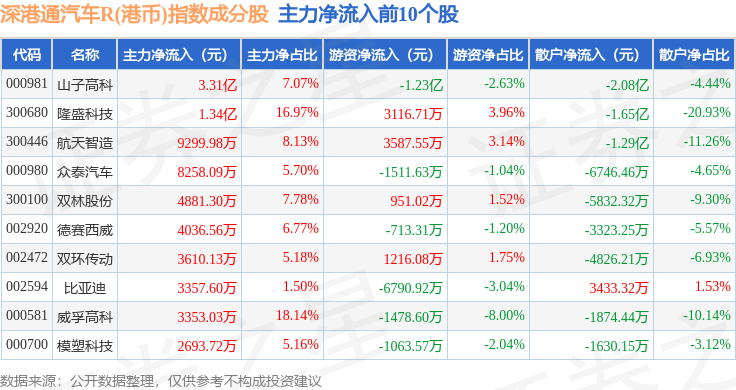 资金流向方面,深港通汽车R(港币)(483040)指数成份股当日主力资金净流入合计3.29亿元,游资资金净流出合计8724.77万元,散户资金净流出合计2.42亿元。成份股资金流向详情见下表: