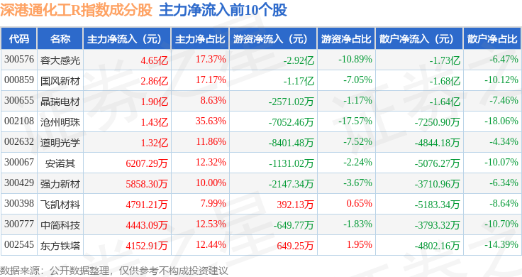 资金流向方面,深港通化工R(483063)指数成份股当日主力资金净流入合计5.03亿元,游资资金净流出合计5.06亿元,散户资金净流入合计357.54万元。成份股资金流向详情见下表: