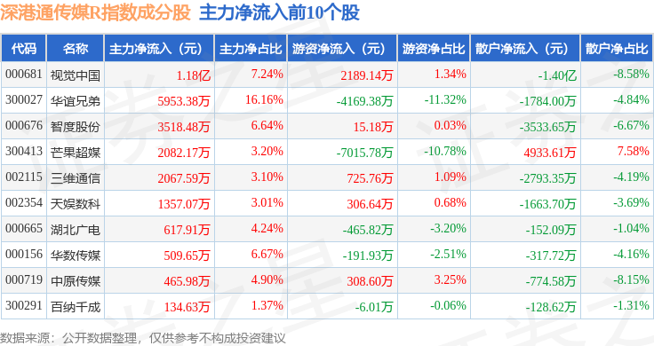 资金流向方面,深港通传媒R(483075)指数成份股当日主力资金净流出合计18.51亿元,游资资金净流入合计1.1亿元,散户资金净流入合计17.41亿元。成份股资金流向详情见下表: