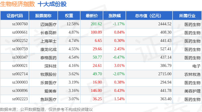 生物经济(970038)指数十大成份股详情如下: