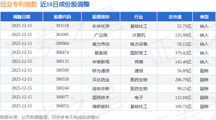 近10日内创业专利(970068)指数成份股做了调整,新纳入了5只股票,剔除了5只股票。