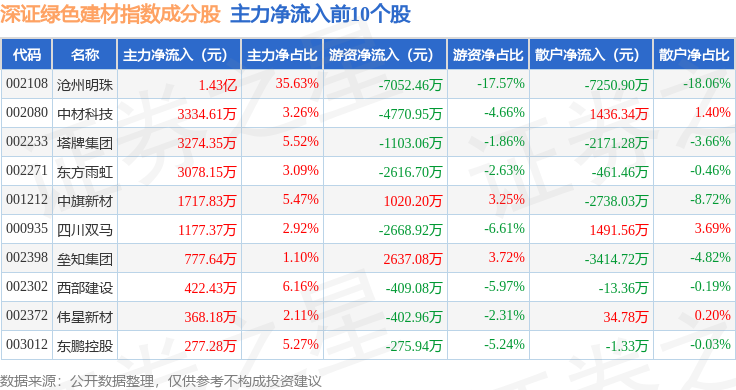 资金流向方面,深证绿色建材(970077)指数成份股当日主力资金净流入合计1.82亿元,游资资金净流出合计1.11亿元,散户资金净流出合计7159.1万元。成份股资金流向详情见下表: