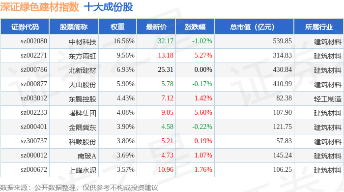 深证绿色建材(970077)指数十大成份股详情如下: