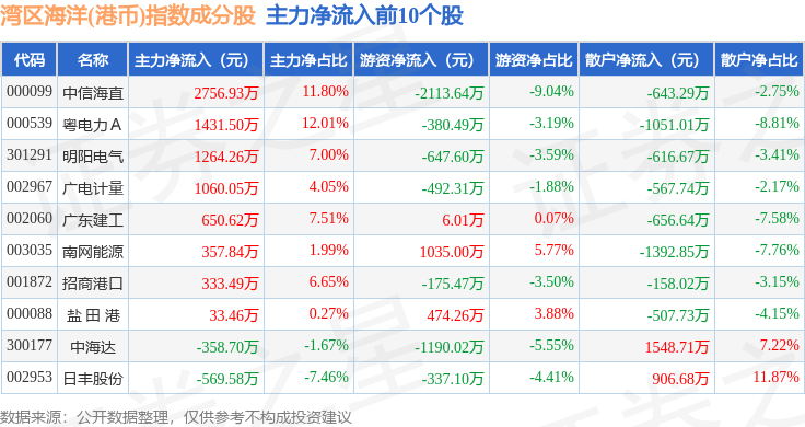 资金流向方面,湾区海洋(港币)(980020)指数成份股当日主力资金净流出合计8629.38万元,游资资金净流入合计2912.15万元,散户资金净流入合计5717.23万元。成份股资金流向详情见下表: