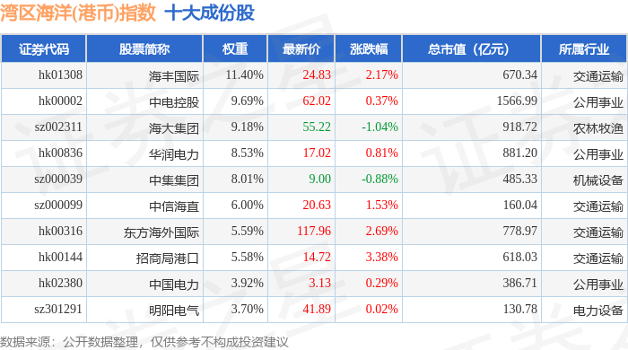 湾区海洋(港币)(980020)指数十大成份股详情如下: