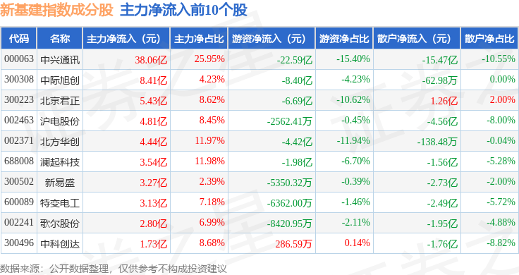 资金流向方面,新基建(980029)指数成份股当日主力资金净流入合计59.46亿元,游资资金净流出合计47.42亿元,散户资金净流出合计12.04亿元。成份股资金流向详情见下表: