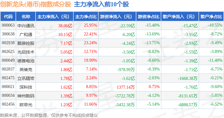 资金流向方面,创新龙头(港币)(980037)指数成份股当日主力资金净流入合计56.85亿元,游资资金净流出合计35.19亿元,散户资金净流出合计21.66亿元。成份股资金流向详情见下表: