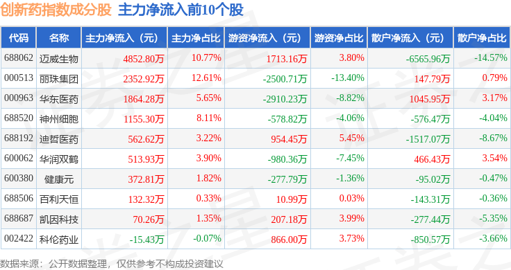 资金流向方面,创新药(980086)指数成份股当日主力资金净流出合计3.04亿元,游资资金净流入合计5038.53万元,散户资金净流入合计2.54亿元。成份股资金流向详情见下表: