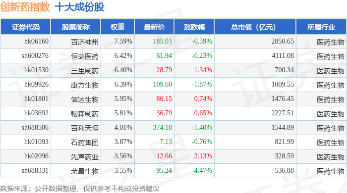 证券之星消息,12月1日,创新药(980086)指数报收于2612.28点,跌0.77%,成交138.76亿元,换手率0.44%。当日该指数成份股中,上涨的有24家,康哲药业以4.21%的涨幅领涨,下跌的有31家,荣昌生物以4.9%的跌幅领跌。