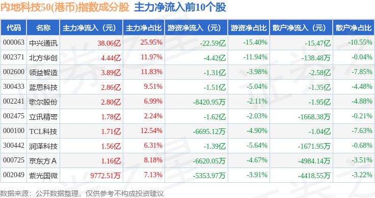 资金流向方面,内地科技50(港币)(983004)指数成份股当日主力资金净流入合计44.37亿元,游资资金净流出合计30.06亿元,散户资金净流出合计14.32亿元。成份股资金流向详情见下表: