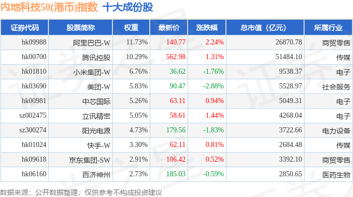 内地科技50(港币)(983004)指数十大成份股详情如下: