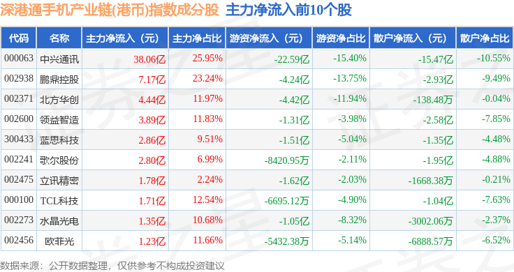 深港通手机产业链(港币)(983010)指数十大成份股详情如下: