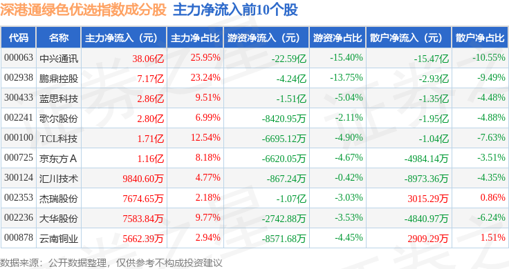 资金流向方面,深港通绿色优选(983011)指数成份股当日主力资金净流入合计50.76亿元,游资资金净流出合计33.71亿元,散户资金净流出合计17.05亿元。成份股资金流向详情见下表: