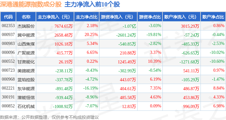 资金流向方面,深港通能源(983013)指数成份股当日主力资金净流入合计2411.69万元,游资资金净流出合计1.11亿元,散户资金净流入合计8646.63万元。成份股资金流向详情见下表: