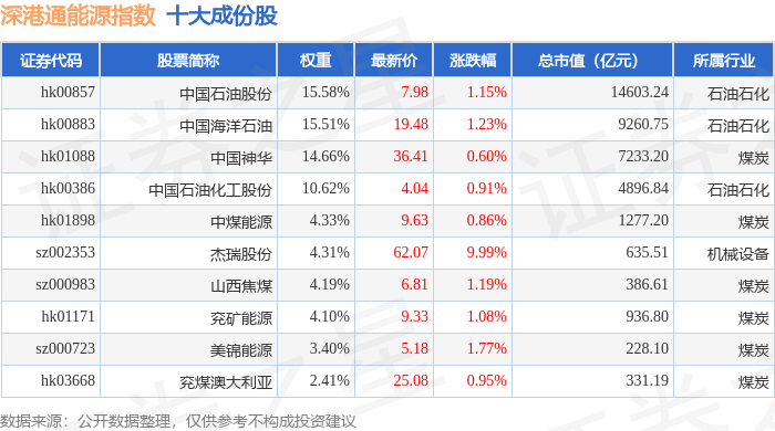 证券之星消息,12月1日,深港通能源(983013)指数报收于6914.85点,涨1.06%,成交83.54亿元,换手率0.42%。当日该指数成份股中,上涨的有24家,杰瑞股份以9.99%的涨幅领涨,下跌的有3家,海新能科以1.5%的跌幅领跌。