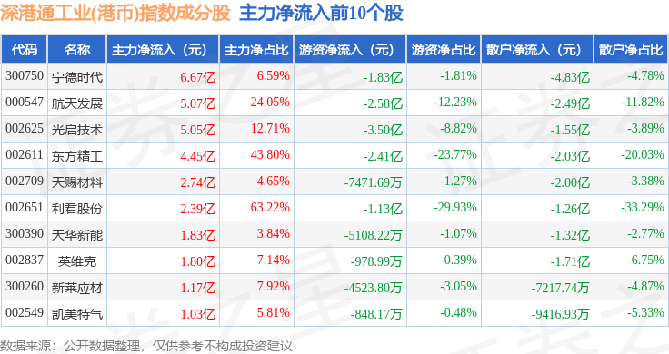 资金流向方面,深港通工业(港币)(983018)指数成份股当日主力资金净流出合计10.82亿元,游资资金净流入合计5.9亿元,散户资金净流入合计4.92亿元。成份股资金流向详情见下表: