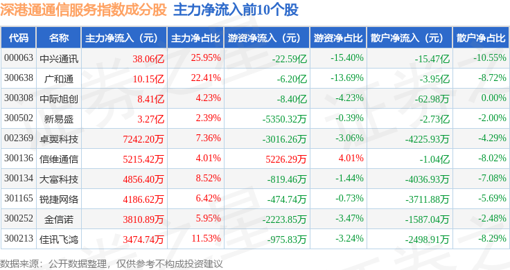 资金流向方面,深港通通信服务(983033)指数成份股当日主力资金净流入合计44.98亿元,游资资金净流出合计35.77亿元,散户资金净流出合计9.21亿元。成份股资金流向详情见下表: