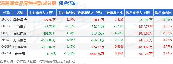 资金流向方面,深港通食品零售(983037)指数成份股当日主力资金净流出合计1.55亿元,游资资金净流入合计2050.54万元,散户资金净流入合计1.35亿元。成份股资金流向详情见下表: