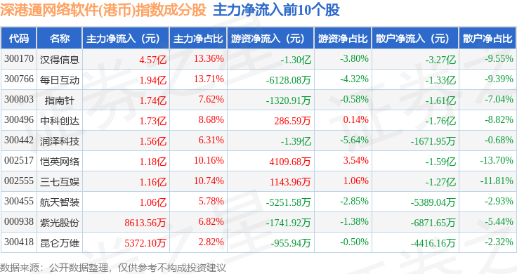 资金流向方面,深港通网络软件(港币)(983048)指数成份股当日主力资金净流入合计9966.19万元,游资资金净流入合计5129.66万元,散户资金净流出合计1.51亿元。成份股资金流向详情见下表: