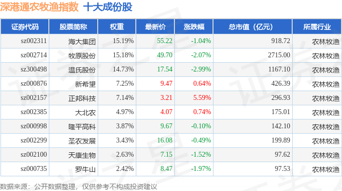 深港通农牧渔(983051)指数十大成份股详情如下: