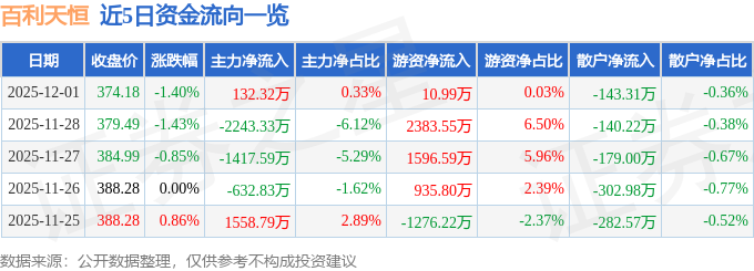 12月1日的资金流向数据方面,主力资金净流入132.32万元,占总成交额0.33%,游资资金净流入10.99万元,占总成交额0.03%,散户资金净流出143.31万元,占总成交额0.36%。