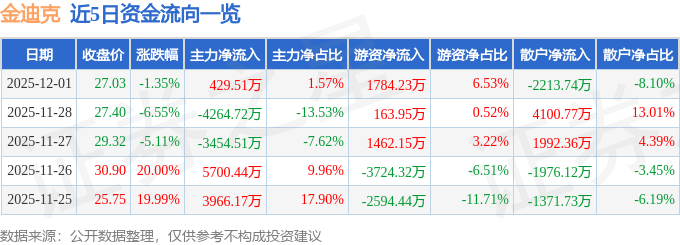 证券之星消息,截至2025年12月1日收盘,金迪克(688670)报收于27.03元,下跌1.35%,换手率8.1%,成交量9.98万手,成交额2.73亿元。