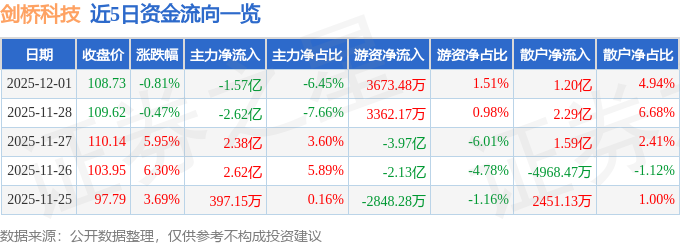 证券之星消息,截至2025年12月1日收盘,剑桥科技(603083)报收于108.73元,下跌0.81%,换手率8.15%,成交量22.47万手,成交额24.31亿元。