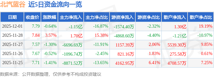 证券之星消息,截至2025年12月1日收盘,北汽蓝谷(600733)报收于7.79元,下跌0.64%,换手率1.77%,成交量86.79万手,成交额6.79亿元。
