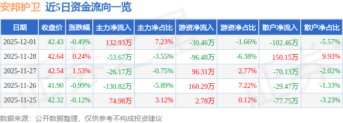 证券之星消息,截至2025年12月1日收盘,安邦护卫(603373)报收于42.43元,下跌0.49%,换手率0.95%,成交量4325.0手,成交额1838.01万元。