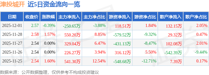 证券之星消息,截至2025年12月1日收盘,津投城开(600322)报收于2.57元,下跌0.39%,换手率2.27%,成交量25.1万手,成交额6452.06万元。