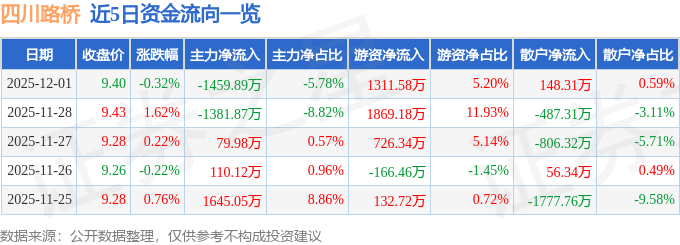 证券之星消息,截至2025年12月1日收盘,四川路桥(600039)报收于9.4元,下跌0.32%,换手率0.31%,成交量27.03万手,成交额2.52亿元。