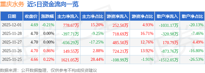 证券之星消息,截至2025年12月1日收盘,重庆水务(601158)报收于4.69元,下跌0.21%,换手率0.23%,成交量10.92万手,成交额5122.3万元。