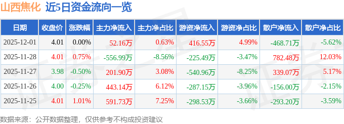 证券之星消息,截至2025年12月1日收盘,山西焦化(600740)报收于4.01元,上涨0.0%,换手率0.81%,成交量20.83万手,成交额8342.67万元。