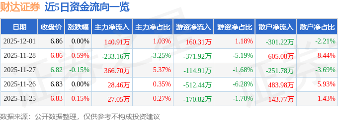 证券之星消息,截至2025年12月1日收盘,财达证券(600906)报收于6.86元,上涨0.0%,换手率0.94%,成交量19.92万手,成交额1.36亿元。