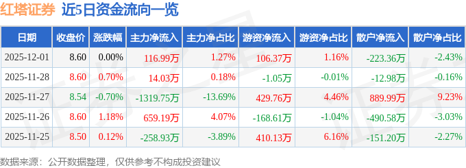 证券之星消息,截至2025年12月1日收盘,红塔证券(601236)报收于8.6元,上涨0.0%,换手率0.23%,成交量10.71万手,成交额9198.67万元。