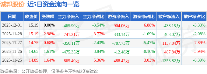 证券之星消息,截至2025年12月1日收盘,诚邦股份(603316)报收于15.19元,上涨0.0%,换手率3.28%,成交量8.67万手,成交额1.31亿元。