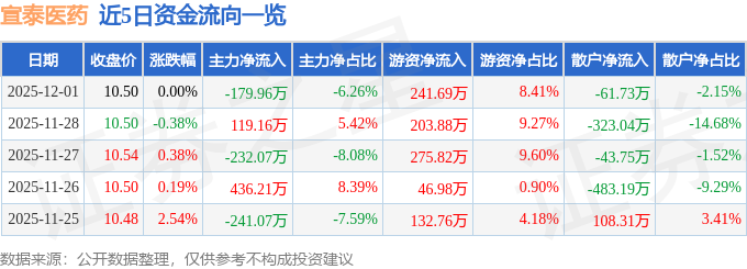 证券之星消息,截至2025年12月1日收盘,宣泰医药(688247)报收于10.5元,上涨0.0%,换手率0.61%,成交量2.74万手,成交额2874.47万元。