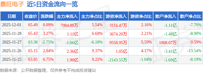 证券之星消息,截至2025年12月1日收盘,景旺电子(603228)报收于65.49元,上涨0.09%,换手率2.26%,成交量22.05万手,成交额14.42亿元。