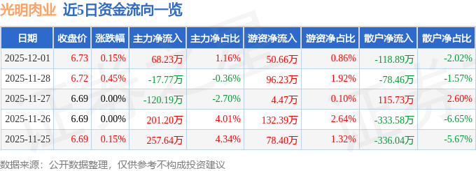 证券之星消息,截至2025年12月1日收盘,光明肉业(600073)报收于6.73元,上涨0.15%,换手率0.93%,成交量8.75万手,成交额5879.78万元。